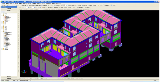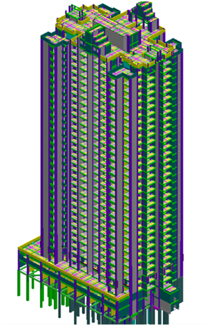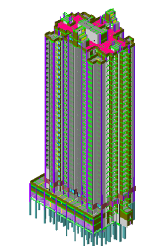 基础为圆形及异形人工挖孔桩,其负二层为车库,负一层和首层为商业,上部为住宅,细部构建有内飘窗、凹凸阳台,屋顶有4个较为复杂的装饰构件。