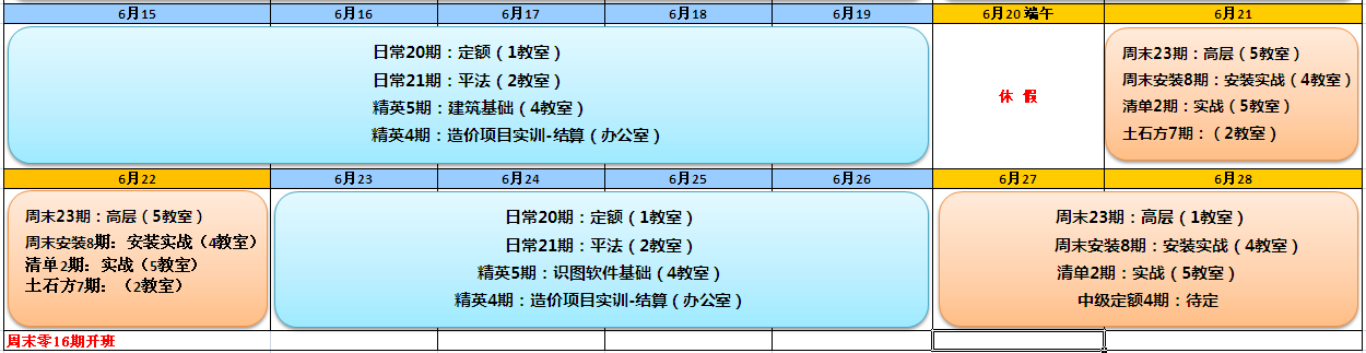 卓远实训2015年土石方7期首次开课时间为2015年6月21日(星期天)上午9:00,培训周期为两天,6月21日(星期天),6月22日(星期一)。上课地点为卓远实训2教室。请报名参加土石方7期培训的学员准时到课!